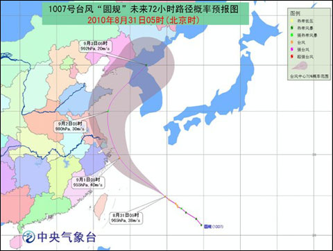 ??? 預計,“圓規”將以每小時25公里左右的速度向西北方向移動,強度還將略有加強,將于31日晚上進入東海東南部海面,以后逐漸向浙江北部到江蘇中部一帶沿海靠近,并有可能于9月1日白天擦過或登陸這一帶沿海北上。