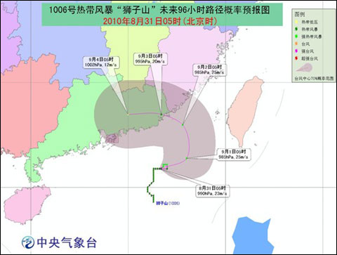 ??? 今年第6號強熱帶風暴“獅子山”已于31日3時在南海北部海面減弱為熱帶風暴, 5時其中心位于廣東汕頭以南大約270公里的海面上,就是北緯20.9度、東經116.6度,中心附近最大風力有9級(23米/秒),中心最低氣壓為990百帕。預計,"獅子山"將在原地徘徊少動,以后將逐漸由偏北方向轉西北方向移動,強度有可能再度加強,并向廣東東部到福建南部一帶沿海靠近。