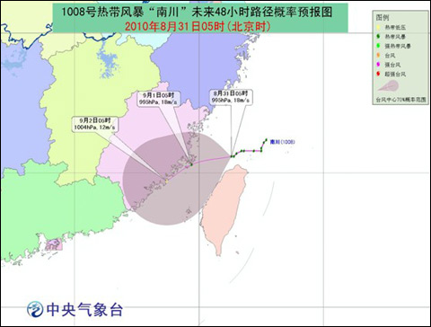 ????今年第8號熱帶風暴“南川”(Namtheum,名字來源:老撾,名字意義:河流名)的中心31日5時位于福建平潭以東大約140公里的東海南部海面,就是北緯 25.6度、東經121.3度,中心附近最大風力有8級(18米/秒),中心最低氣壓為995百帕。預計,風暴中心將以每小時5-10公里的速度向西偏南方向移動,逐漸向福建連江到泉州一帶沿海靠近,有可能于31日夜間到9月1日白天擦過或登陸這一帶沿海,強度緩慢減弱。