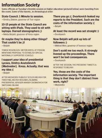 ????一名克里姆林宮官員說,總統最關注那些會議期間不集中注意力的人,而不是使用微博客的問題。隨后,尼基塔作出道歉。 |
