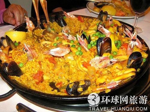 ????西班牙美食中海鮮飯占有很重要的地位,海鮮飯種類很多,大多以黃色為主,這是用專門的海鮮飯原料調制的。這種原料是一種黃色植物粉末,它有香味,而且能去除海鮮的腥味,讓米飯粒粒發亮。