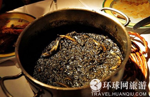 ????在海鮮飯的系列中還有一種墨魚汁海鮮飯。西班牙當地人管它叫海鮮黑飯。米飯發黑的原因就是因為使用了黑色的墨魚汁。