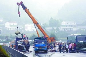????消防隊員立即使用救援器材,慢慢將車廂頂起,并清理貨物。上午9點30分左右,全身多處骨折的趙仁軍成為第一名獲救人員。據參與救援的消防隊員介紹,趙仁軍十分幸運,他在貨車車尾處,應該是被車尾撞飛后倒下的,僅被一些貨物壓住了雙腿。經過幾分鐘的清理,他便獲救了。不過救援人員后來才發現,趙仁軍是這7名工人中的唯一生還者。其余6人,有的被貨車車廂的鐵架壓住,有的被貨物埋壓。消防隊員將他們從車底抬出時,已是一具具冰冷的尸體。