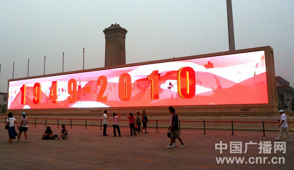 ????2010年9月6日傍晚,北京,天安門廣場人民英雄紀念碑北側,兩塊新近亮相大理石基座的LED巨屏開始調試,以新穎靚麗的視頻畫面迎接國慶節的到來。