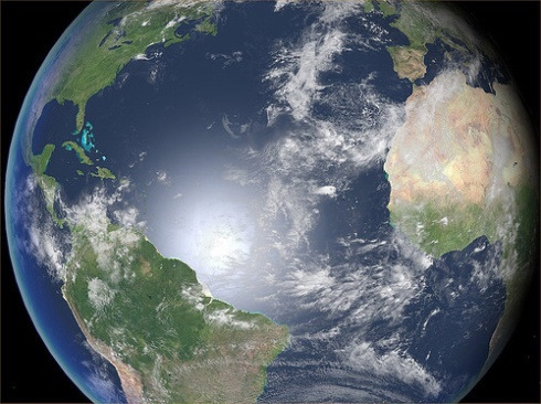 這是一張地球廣角照片,中心位于南美洲和非洲之間的大西洋