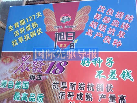 在吉林榆樹的種子商業(yè)街上,經(jīng)常會看到種子廣告打著“美國血緣”字樣。 金微/攝
