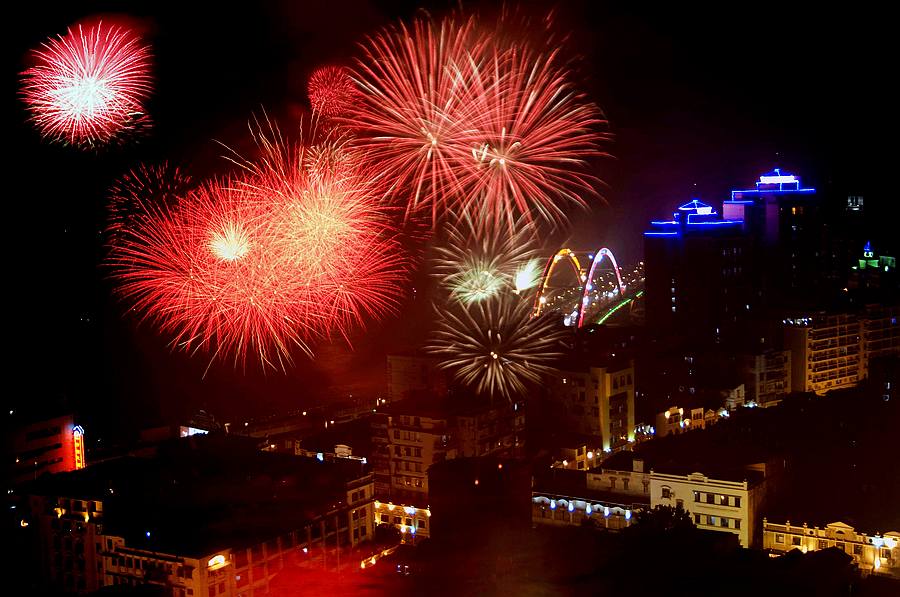 10月30日晚,第六屆梧州國際寶石節焰火晚會在西江南岸舉行,多彩焰火美不勝收。(麥朝樞攝)