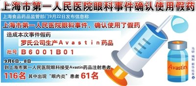 ????上海市第一人民醫(yī)院眼科事件發(fā)生后,上海市食品藥品監(jiān)督管理局對涉嫌的瑞安診所和上海市第一人民醫(yī)院進行了立案調(diào)查。經(jīng)羅氏公司總部和上海藥品鑒定機構分別對查獲的4瓶藥品的包裝材料、說明書和產(chǎn)品品質(zhì)進行鑒定,確定造成本次事件的標示為羅氏公司生產(chǎn)、批號為B6001B01的Avastin藥品為假藥。