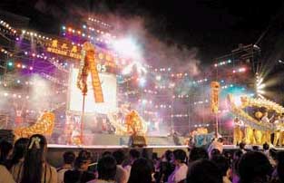 當(dāng)晚盡管下著淅瀝的小雨,卻絲毫擋不住廣大市民欣賞晚會(huì)的熱情。接近8時(shí),偌大的一中操場已經(jīng)坐滿了觀眾。熱鬧、喜慶的龍獅舞《龍騰盛世》拉開了晚會(huì)的序幕,祥龍飛舞,醒獅翻騰,一下子就把晚會(huì)推向了一個(gè)小高潮。著名歌唱家王宏偉一支慷慨激昂的《中華情》,極大地調(diào)動(dòng)起觀眾的情緒,頓時(shí)場下觀眾歡呼雀躍,不停地?fù)]動(dòng)著手中的熒光棒。內(nèi)地當(dāng)紅歌星張敬軒為觀眾帶來了他的成名曲《斷點(diǎn)》,當(dāng)熟悉的旋律響起來時(shí),觀眾的掌聲四起,叫聲不斷,整個(gè)操場沸騰起來。你方唱罷我登臺(tái),香港的超人氣偶像組合Twins則趁熱打鐵,馬上又送出了兩首充滿青春活力的《星光游樂園》、《救生圈》,梁漢文、方力申、王蓉、羅嘉良等觀眾耳熟能詳?shù)难輪T、歌星陸續(xù)登臺(tái)表演,使晚會(huì)的高潮一浪高過一浪。
