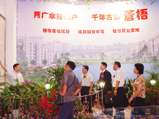 ??? 展廳內(nèi)展出的全縣經(jīng)濟(jì)規(guī)劃、發(fā)展成就、合作項(xiàng)目引起來賓的濃厚興趣,他們紛紛駐足詢問相關(guān)情況。整個(gè)主展廳布置得流光溢彩、令人目不暇接。四周是我縣“十五”規(guī)劃重點(diǎn)發(fā)展的經(jīng)濟(jì)形象展,旅游、農(nóng)業(yè)、工業(yè)等特色及高科技產(chǎn)業(yè)展均在其中。梧州市時(shí)任副市長(zhǎng)竺坤松、楊錦萍在縣有關(guān)領(lǐng)導(dǎo)的陪同下參觀展廳,他們對(duì)展廳內(nèi)極具特色的產(chǎn)品圖片展表現(xiàn)出了濃厚的興趣。