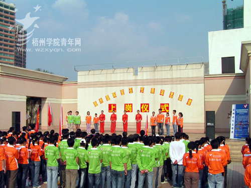???“當好東道主,熱情迎嘉賓,用真誠和愛心為第三屆梧州國際寶石節添光彩、爭做貢獻!”——2006年9月25日下午,梧州學院兩百余名青年志愿者在“‘第三屆梧州國際寶石節’青年志愿者上崗儀式”上莊重宣誓。