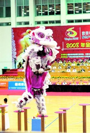 在剛剛落幕的第六屆全國(guó)農(nóng)民運(yùn)動(dòng)會(huì)中,代表廣西參賽并奪得“舞獅全能金獎(jiǎng)”的藤縣醒獅團(tuán)自然是全場(chǎng)的焦點(diǎn)。精神抖擻的雄師一出現(xiàn),當(dāng)即獲得觀眾的掌聲。他們拋棄陳規(guī),沒(méi)有從第一個(gè)樁上樁,而是選擇了從高度更高的第二個(gè)樁上樁。氣定神閑的白獅在上面跳躍翻騰,耍起了360度轉(zhuǎn)身、快捷連環(huán)跳樁等高難度動(dòng)作,驚險(xiǎn)迭出。隊(duì)員們高超的技巧、靈活的腳下功夫贏得了全場(chǎng)掌聲。