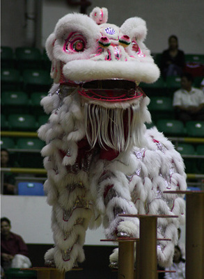 廣東廣寧龍獅武術(shù)團(tuán)選用了C樁,扭動(dòng)著身子跳上梅花樁,歡騰飛越,一抬頭、一踢足都揮動(dòng)著和諧喜慶。該獅隊(duì)用腳去采青也讓觀眾驚嘆不已。而他們翻身下地,更是藝高人膽大,整套動(dòng)作無(wú)懈可擊。