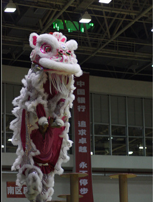 第三支出場(chǎng)的遼寧省沈陽(yáng)市武術(shù)協(xié)會(huì)龍獅團(tuán)也步了前兩支隊(duì)的后路,在最后采青的時(shí)候,沒(méi)能踩住鐵柱,整個(gè)獅子掉到了地板上。當(dāng)只有13歲的獅頭黃錦彬再一次走上梅花樁時(shí),全場(chǎng)報(bào)以雷鳴般的掌聲。采青完后,黃錦彬以一個(gè)漂亮的飛身越過(guò)2.81米的鋼橋。