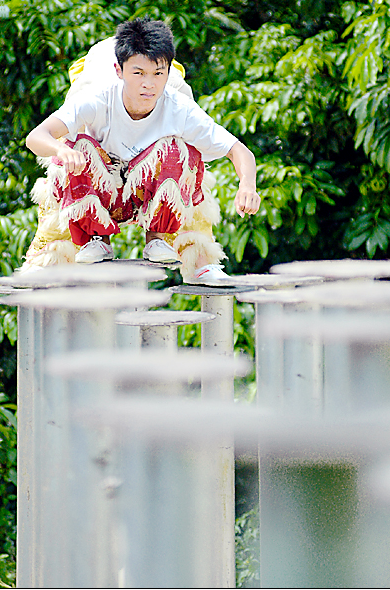 獅頭獅尾同時空翻下樁,是禤洲獅隊苦練的高難度動作之一(何鎏攝)