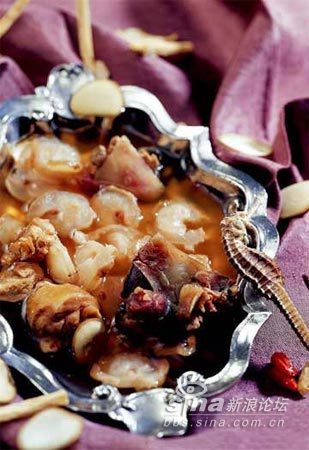 ????材料:牛鞭、柴雞、黨參、西洋參、枸杞子、甲魚、海馬、火腿、鹿茸、巴棧。