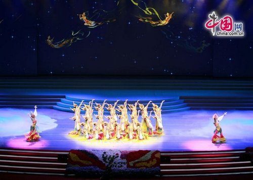 ????在世博中心(網上世博中心)舉行的中國國家館日文藝晚會上,璀璨的星空布景中,中華文明孕育近千年的敦煌“飛天”走出歷史長卷,婀娜多姿、熠熠生輝。