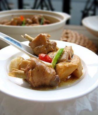 ????5.鍋內(nèi)留少許底油,將2中豆豉煸香,下1中雞塊、姜片及炸過(guò)的蒜粒,翻炒至雞皮出油焦黃,噴少許料酒,加入蠔油、冰糖及清水(以稍平于材料面為準(zhǔn)),大火煮開(kāi)后,連材料帶湯水一同倒入砂鍋內(nèi),加蓋煲煮;