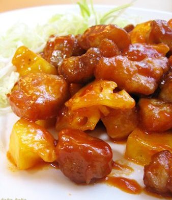 ????4.鍋內注入少許油,中小火將蒜粒爆香,將制作調料②中的番茄醬、白糖、鹽、醋,以及高湯半碗入鍋,攪拌均勻煮沸,倒入水淀粉拌勻,湯汁變濃稠后,將3中的肉塊放入,翻炒均勻,再將菠蘿塊放入,混合均勻后起鍋裝盤。