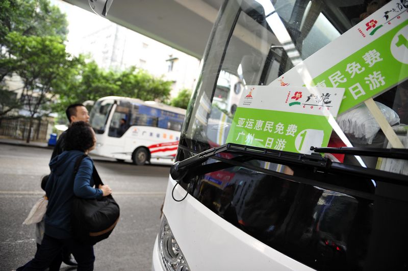 11月12日上午9點(diǎn)左右,游客準(zhǔn)備乘大巴參加亞運(yùn)惠民廣州免費(fèi)一日游,共享廣州亞運(yùn)盛會(huì)。當(dāng)日,第十六屆亞洲運(yùn)動(dòng)會(huì)即將在廣州開(kāi)幕。新華社記者梁旭攝