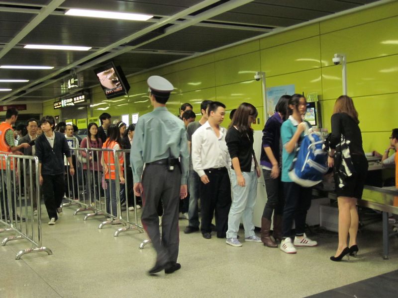 進入地鐵站的乘客正排隊接受安檢。乘客隨身攜帶的物品需經(jīng)過道式X光機的“機檢”,未攜帶物品的乘客則由工作人員使用金屬探測儀對其進行“人檢”。陳素雅 羅麗思攝
