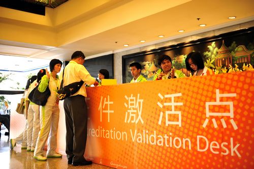 11月12日中午12點左右,在第16屆亞運會總部飯店證件激活點,來自香港大學的志愿者袁俊杰(左二)正在為外賓核對信息。