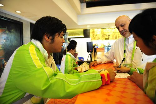 ????“雖然當一名志愿者確實有些辛苦,但是很有意義。”和許多的亞運志愿者一樣,每天早上六點鐘左右,袁俊杰就要起床,在簡單打理之后搭上班車到指派的場所展開一天的工作,晚上通常要到9點才能回到住所。“每天回到房間什么事都不想做了,倒下就能睡著。因為這樣可以養足精神干好第二天的工作?!?/p>