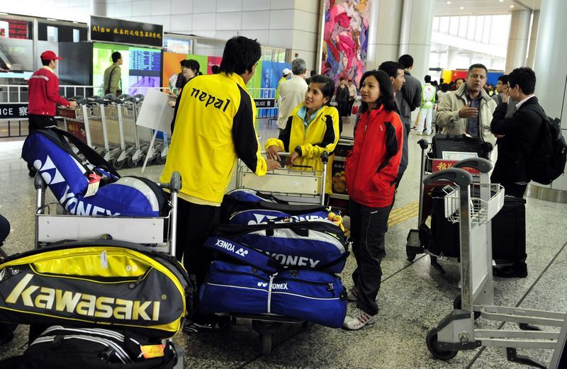 11月12日10點左右,參加廣州亞運會的尼泊爾代表團成員在白云機場等候出發,前往運動員村。當日,第十六屆亞洲運動會即將在廣州開幕。新華社記者陳曄華攝