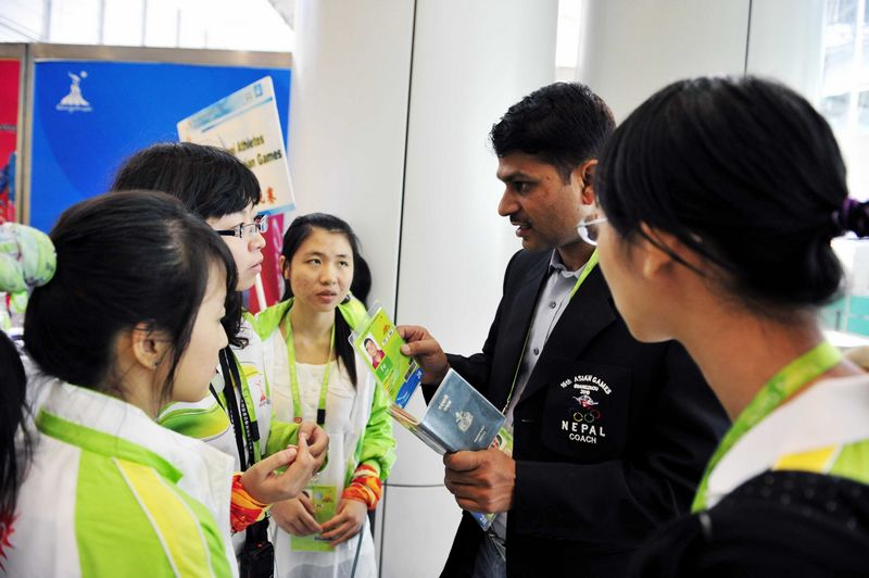 11月12日10點左右,一位參加廣州亞運會的尼泊爾代表團成員在白云機場向志愿者咨詢車輛問題。當日,第十六屆亞洲運動會即將在廣州開幕。新華社記者陳曄華攝