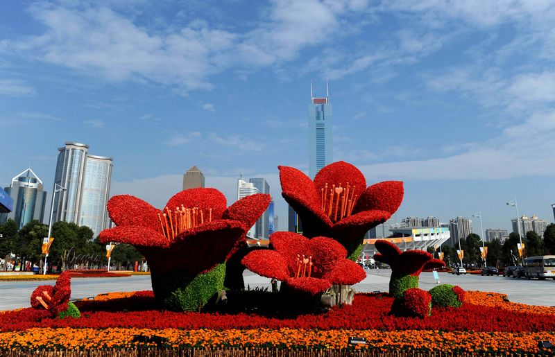 11月12日晚上20時,第16屆亞運會開幕式即將在廣州舉行。這是用花朵裝扮一新的廣州天河體育中心。新華社記者宋振平攝
