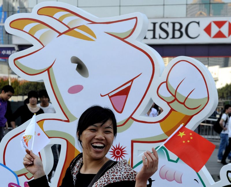 11月12日,一位市民在廣州街頭的廣州亞運會吉祥物“樂羊羊”雕塑前留影。當晚20時,第16屆亞運會開幕式將在廣州舉行。新華社記者宋振平攝