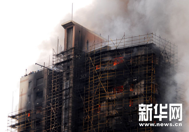 16時(shí)20分,大火已經(jīng)持續(xù)了兩個(gè)多小時(shí)尚未被撲滅,大樓內(nèi)仍有居民尚未逃出,頂樓還有不少被困居民在等待救援。新民網(wǎng)記者在現(xiàn)場看見,經(jīng)過大火猛烈的炙烤,已經(jīng)有腳手架在往下掉落了,現(xiàn)場十分危險(xiǎn)。