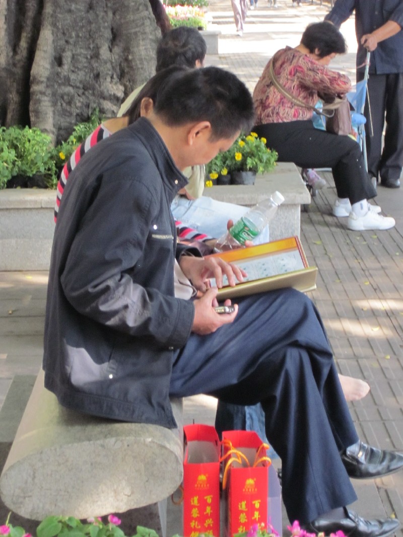 兩位廣州市民在欣賞亞運大禮包中的精美禮品。 |