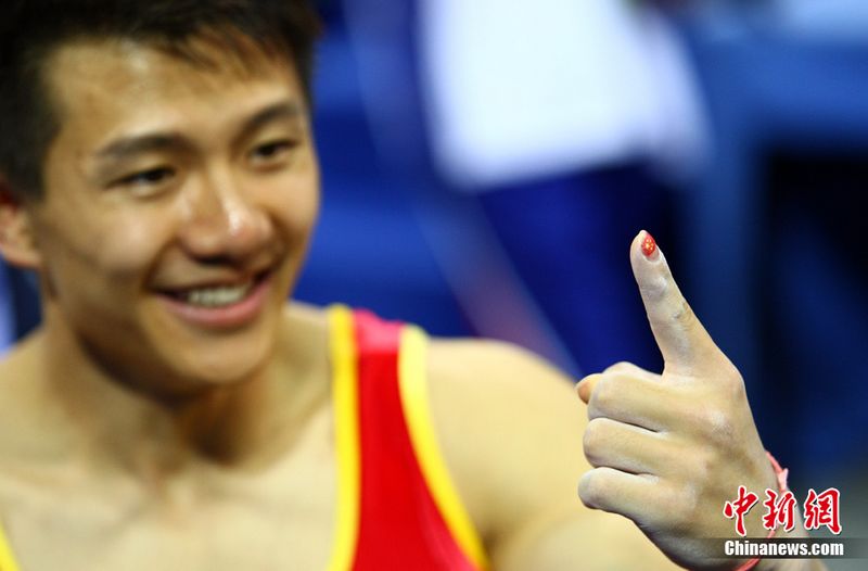 11月16日,中國體操名將陳一冰在廣州亞運會男子吊環決賽上奪得金牌。獲勝的他在展示手指上的國旗。