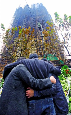 ??? 昨日,遇難者家屬在悼念現場悼念遇難親人。21日是上海“11·15”特別重大火災事故發生的第7天,上海市委書記俞正聲、上海市長韓正等官員來到膠州路火災事故現場,與民眾一起獻上鮮花,向遇難者致哀。據目擊者稱,約有10萬公眾前往現場獻花。新華社發