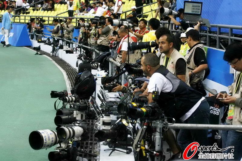 2010年廣州亞運會,攝影記者搶占位置靜候劉翔。