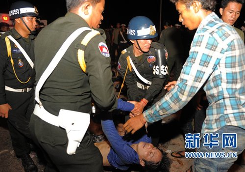 11月23日,柬埔寨軍警在金邊搬運踩踏事件遇難者遺體。新華社/法新