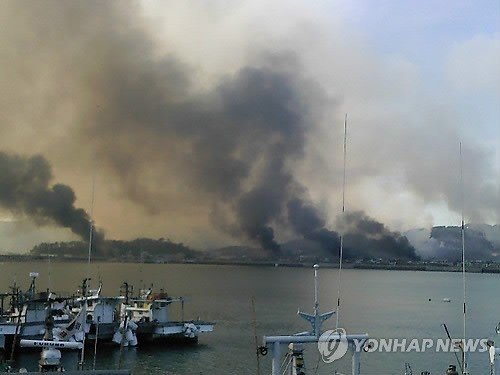 炮擊后硝煙彌漫的延坪島