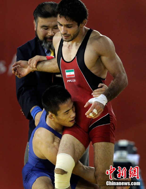 亞運摔跤比賽在廣州華南理工大學體育館進行,伊拉克選手哈馬蒂在與中國選手高峰(藍方)爭奪季軍的比賽中的第一局就不慎扭傷膝蓋,但他仍堅持完比賽。而獲勝后的高峰也不忘將對手輕輕抱起來,送回到教練身邊,令人感動。