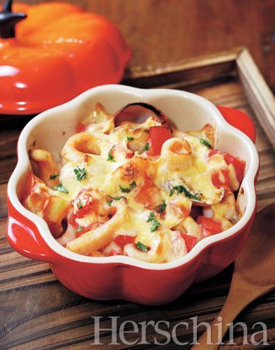 ????4. 在上面鋪滿馬蘇里拉奶酪碎和法香碎,放入預熱至180℃的烤箱中,烤15分鐘即可。