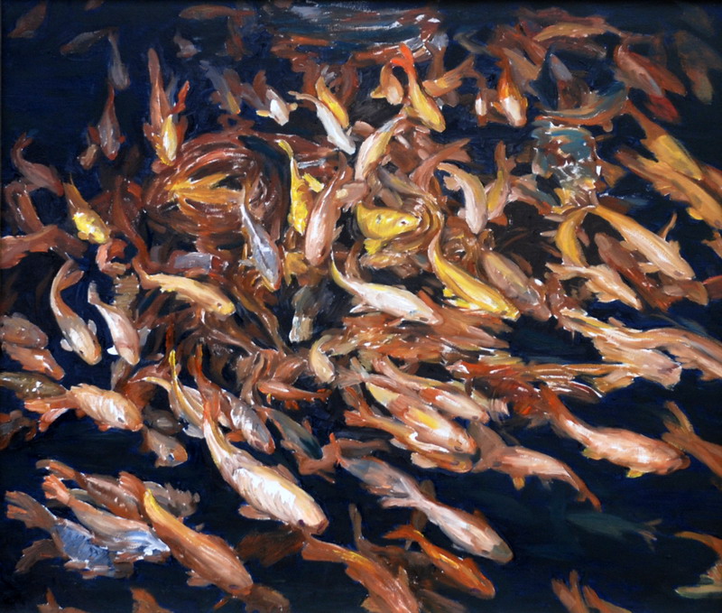 描繪活潑可愛的群魚,魚游弋的神態各異,作品在深色背景下,把魚群的亮色襯托得閃閃發亮,增強了色彩的表現力,藝術性極強。