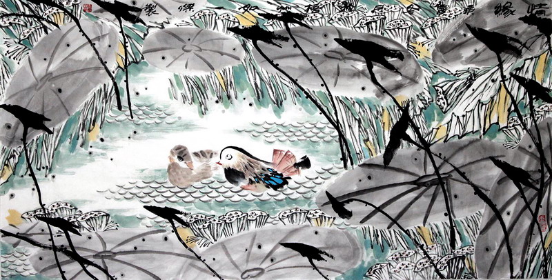 ??? 描繪了一對鴛鴦在恬靜荷塘里享受大自然的無限靜謐之美,裝飾性很強,墨筆相得益彰,是作者近年來的突破之作。