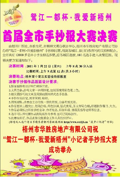??? “鴛江一都杯?我愛新梧州”小記者小編輯手抄報(bào)大賽由梧州日?qǐng)?bào)社、市教育局、市精神文明辦聯(lián)合舉辦,梧州市華勝房地產(chǎn)有限公司協(xié)辦,以“我愛新梧州”為主題,目的為了更好地促進(jìn)青少年德、智、體、美全面發(fā)展,讓更多青少年參與社會(huì)實(shí)踐,讓我市的中小學(xué)生了解梧州、發(fā)現(xiàn)梧州,激發(fā)我市未成年人“愛國、愛家、愛梧州”的熱情。