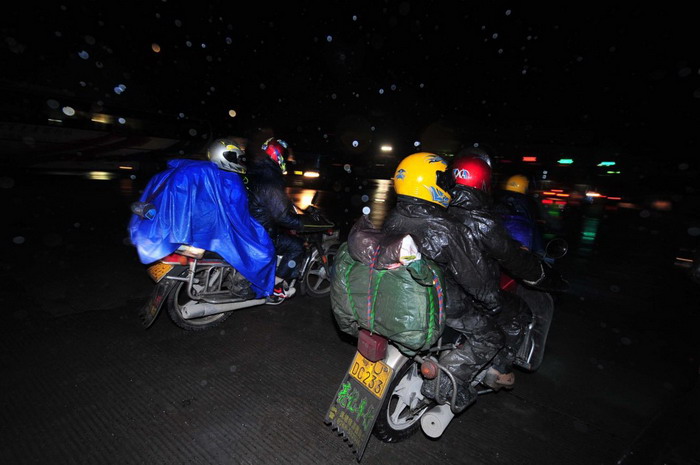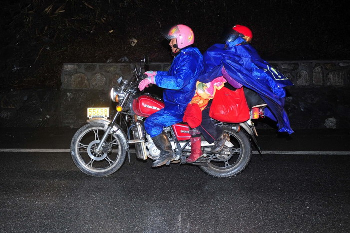 ????1月19日,在210國道南丹縣境內,一家三口騎著摩托車在雨中趕路。 棉衣、護膝、雨衣、棉毯、手套……當日,一群“全副武裝”騎摩托車冒雨返鄉的農民工行至210國道廣西南丹縣境內。據介紹,這批數十人組成的摩托車返鄉隊伍1月17日從廣東出發,準備驅車近2000公里回貴州老家過年,預計20日可抵達。 新華社記者 黃孝邦/攝