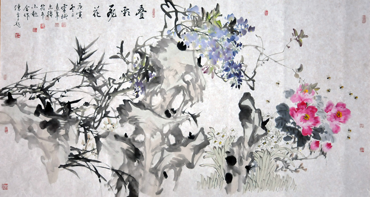 李靈機、李憙年、何志強、林筱本、陳小勛、陳宇等書畫家集體創(chuàng)作的中國畫《疊彩飛花》 定價:3800元