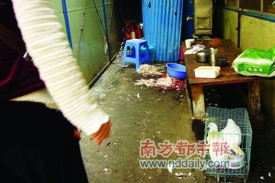 ????在保安宿舍的地上可以看到宰殺后的鴿子毛,旁邊還關著幾只之前被放生的白鴿。 南都記者 陳文才 攝