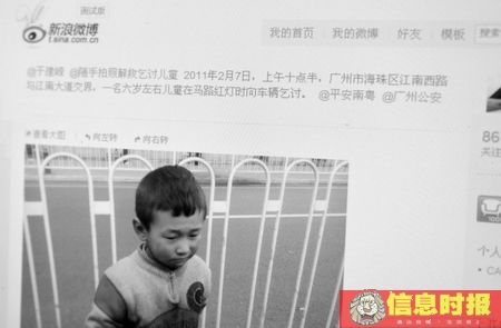 ????信息時報訊 (記者 朱宏) 昨日,“隨手拍照解救乞討兒童”的廣州志愿者們在街上尋找乞討兒童以及搜集相關數據的同時,新浪微博上不少熱心網友也積極參與其中,將遇到的街邊行乞兒童發上微博。有熱心網友直接報警,讓警方介入。
