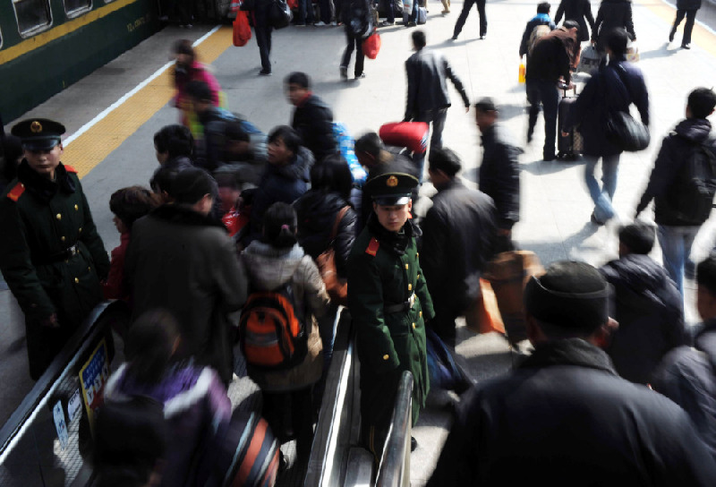 ??? 2月19日,前往廣東東莞方向的旅客在合肥站乘車。當日,合肥火車站日發送客流突破7萬人次,迎來了2011年春運最后一輪客流高峰。
