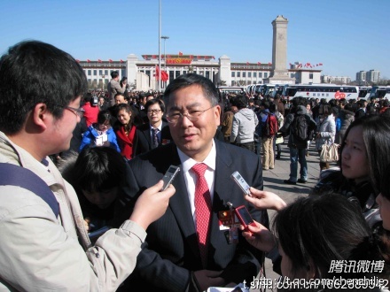 ??? 陳志列:從大會堂東門拾階而上,若想突圍1千多人的記者陣,最好的辦法就是低頭往前走。但是正好遇到一個深圳的記者把我攔下,要求和我們深圳的委員們合影,結果一下子就又涌過來很多的麥克風要求采訪,這才發現我被包圍了。等我采訪完了,那邊的合影也結束了。借用一下這位記者的照片,我在人堆里。