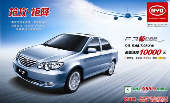 ?2月18日,比亞迪官方宣布,旗下五款車型F0、F3、F3R、G3、F6實行官方降價,回饋消費者對比亞迪的支持。其中,作為比亞迪的開山之作,F3新白金版豪華型官降幅度更是達到10000元,現指導價僅6.68萬,全面讓利消費者,誓將超值進行到底。